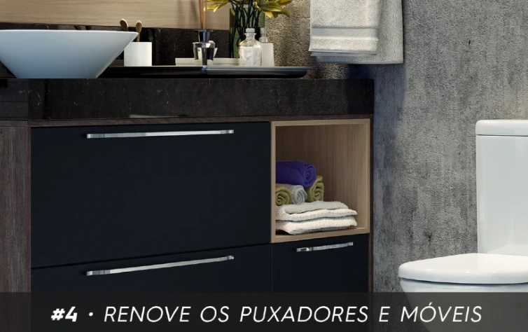 A melhor maneira de dar uma cara nova aos armários do banheiro sem fazer reforma é substituir os puxadores atuais por novos. Dessa forma, você consegue trocar totalmente o estilo do seu banheiro, indo do elegante para o rústico ou do clássico para o moderno. Antes de decidir em qual tipo de puxador você vai investir, é importante fazer uma avaliação do estilo do móvel, para não destoar. Vale também investir em algum móvel planejado um pouco mais neutro. Além de ser feito para aproveitar melhor o espaço do seu banheiro, ele acaba sendo mais versátil na hora de inovar na decoração.