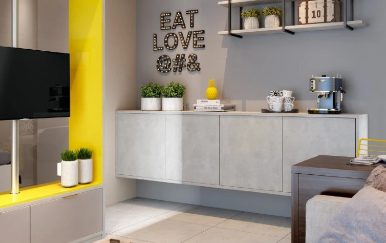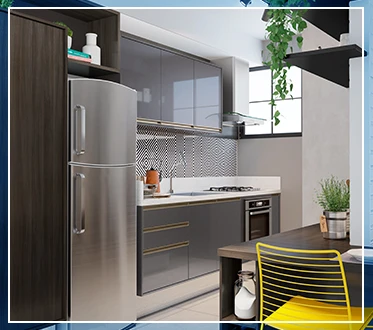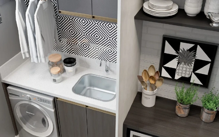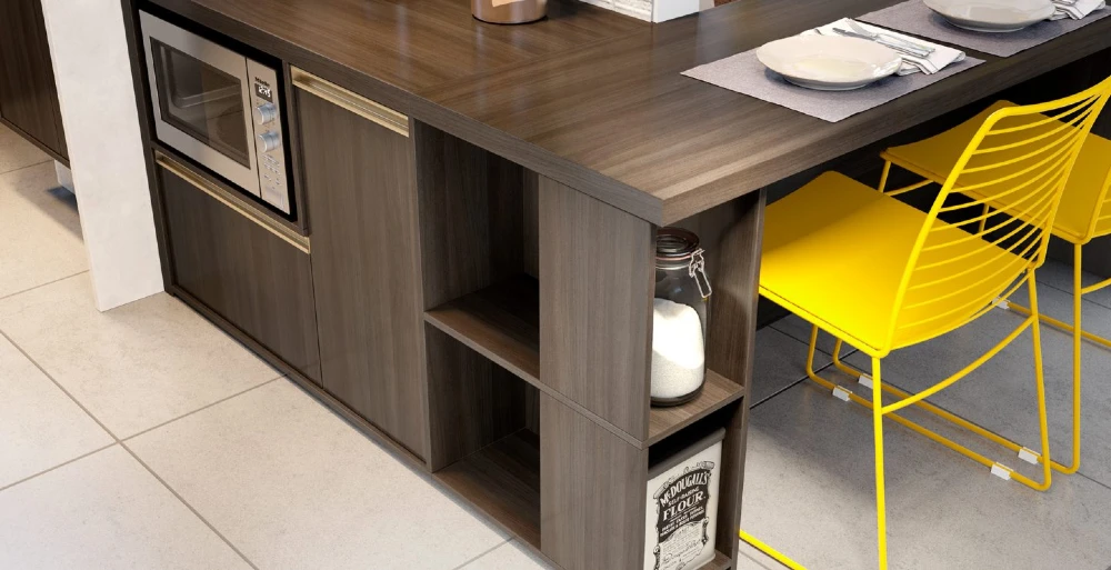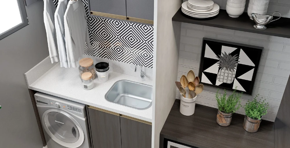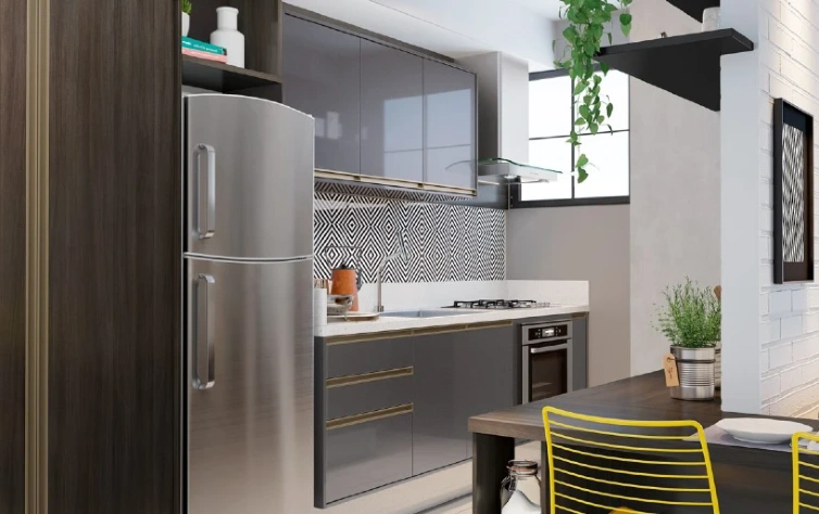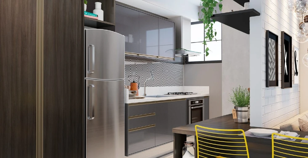 A mobília têm grande influência deste estilo. Pode seguir o padrão industrial, com tons mais fechados e estruturas metálicas à mostra, como as nossas prateleiras da linha Nero, semelhantes a serralheria. Tons neutros e texturas também marcam presença – um exemplo, são as frentes desse armário aéreo que possui frentes do padrão Eros, com textura semelhante a mármore.