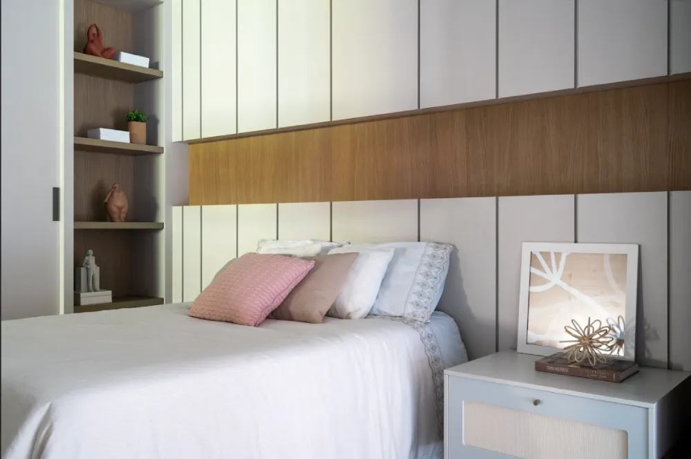 Um guarda-roupa ou armário planejado é crucial para manter o ambiente organizado. Em um dormitório de casal, os armários planejados podem incluir divisórias específicas para cada pessoa, facilitando a organização. Opções como portas de correr, espelhos e iluminação interna podem ser incorporadas para otimizar ainda mais o espaço. Para dormitório de solteiro, optar por um armário embutido pode liberar mais área útil para outras atividades.